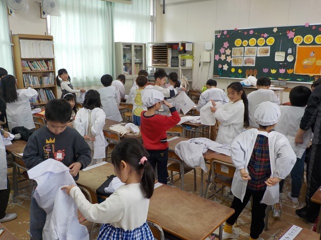 教えていただいた後は、実際に給食セットを持ってきて、白衣に着替える練習もしました。