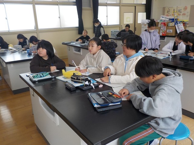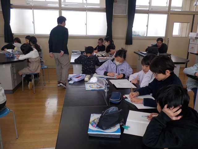5年生になって初めての理科の授業。先生からの意外なクイズに、教室は一気に活気づきました。「チューリップが並んでたで。」「桜やろ?あ、桜は木か」と、班の仲間と顔を見合わせて一生懸命に考えます。