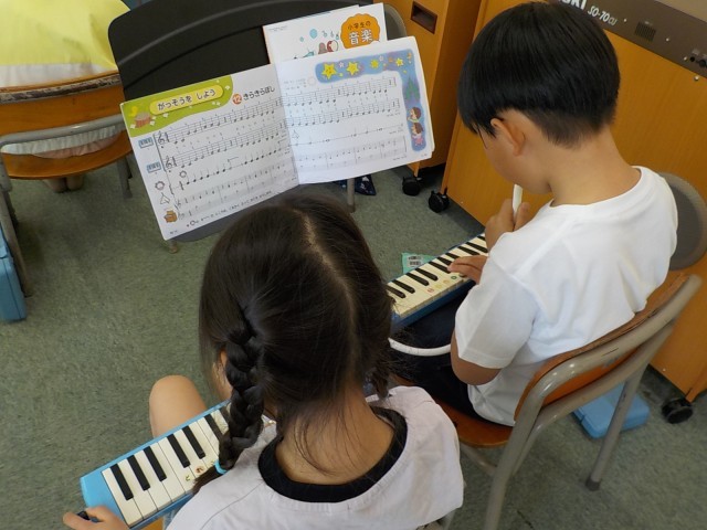 音楽室から、優しいメロディが聞こえてきました。2年生の音楽の授業では、今、鍵盤ハーモニカの練習に励んでいます。繰り返し練習していたのは、みんなが大好きな「きらきら星」です。「♪ド・ド・ソ・ソ・ラ・ラ・ソ……」と、 一つひとつの鍵盤を小さな指で押さえます。