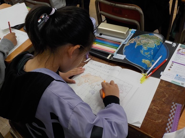 学習では世界地図の白地図を使って、大陸ごとに色を変えて塗り分けていきました。ぼんやりとしていた大陸の姿が、鮮やかに浮かび上がってきます。「ユーラシア大陸ってめっちゃ広いな。」、「日本は世界と比べると小さいな。」と、手を動かすことで新しい発見がたくさんあります。