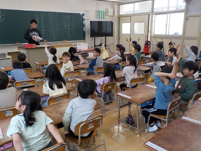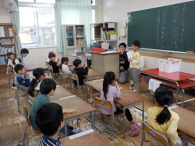 1年生の教室から、元気いっぱいで楽しそうな声が聞こえてきました。今日は国語の授業で、一人ずつ作文の発表会をしています。
