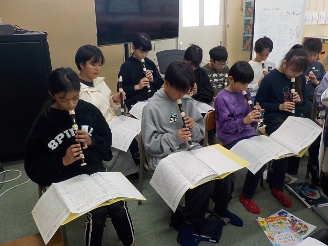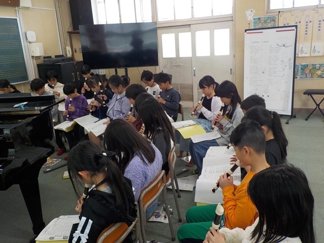 高学年になって曲の難しさもアップしています。「シのフラット(♭)の指使いに気を付けて。」や、「ソから低いドに音が移るとき、リズムが遅れないようにスムーズに。」と、練習では先生の熱心なアドバイスが響きます。子ども達は難しい運指に苦戦しながらも、一音一音を丁寧に練習を重ねていました。