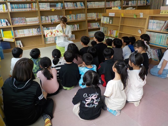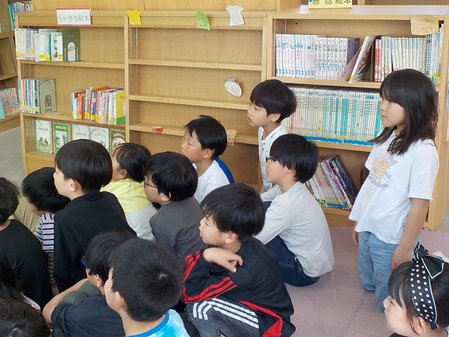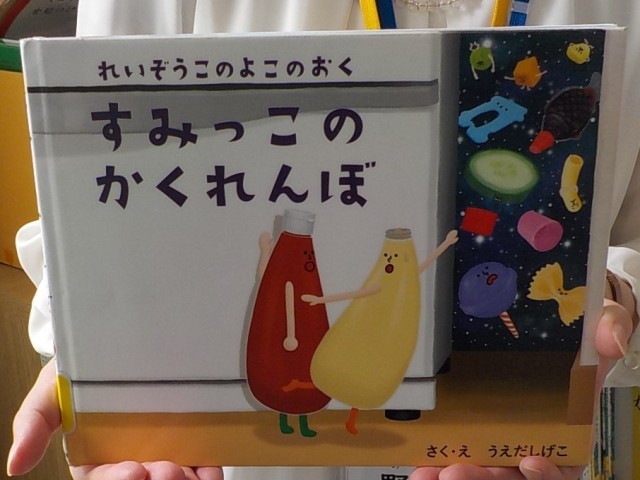 図書は子ども達が大好きな時間です。2年生の子ども達が学校司書の先生の周りに集まると、楽しみな読み聞かせのスタートです。今日、司書の先生が選んでくださったのは、うえだしげこさんの絵本『れいぞうこの よこのおく すみっこの かくれんぼ』です。