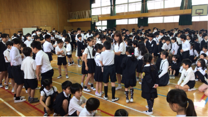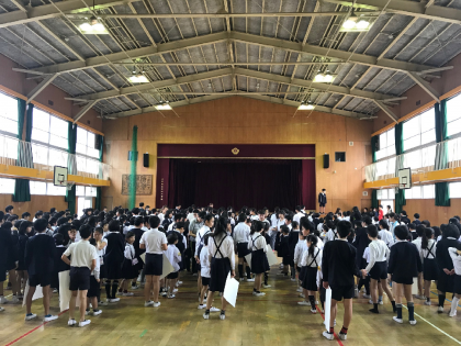 今年度最初の児童集会は「伝言ゲーム」でした。