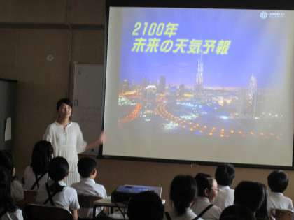 気象予報士の木島さんと西口さんによる地球温暖化の最新情報『未来の地球と私たちのくらし』の授業を受けました。未来の天気予報や世界の気温の変化、温暖化の原因等について学びました。