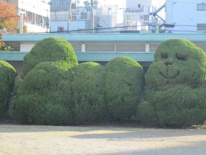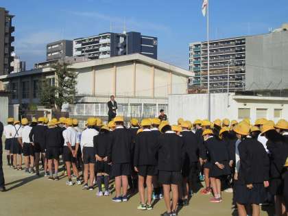 11月18日(月)、秋の晴天の下、全校朝会がありました。秋の深まりとともに、植物の葉の色の変化と落葉についての話がありました。また、その落ち葉を掃除してくれている管理作業員さんについて、運動場の側溝の土あげや、給食室横の植栽のモンスターをつくるなどお仕事の紹介の話がありました。