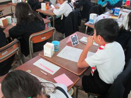歯垢のできかたや、むし歯になりやすいおやつの食べ方などを学んだ後、実際に歯を薬で染め、歯垢を確かめた上で、ブラシを使って歯をきれいにみがく練習をしました。
