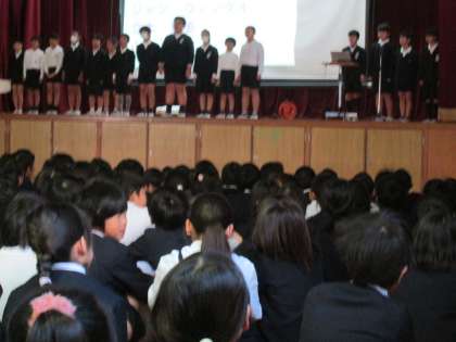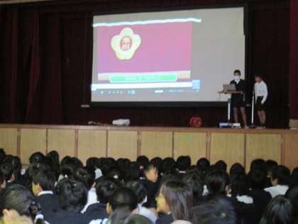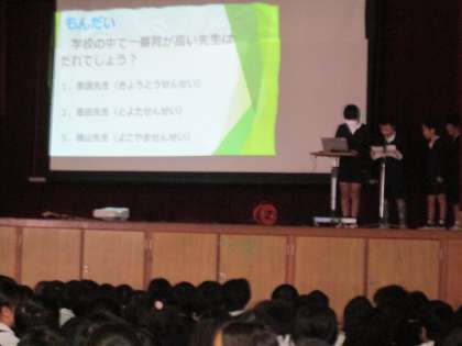 11月21日(木)の児童集会はパソコンクラブの発表でした。講堂においてパソコンクラブの子どもたちが、4グループに分かれてクラブの時間にパソコンで作ったクイズを、全校児童に出題しました。