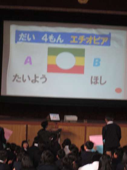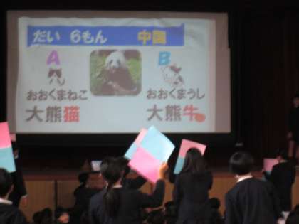 1月9日(木)の児童集会は「友だちの国・友だちのことを知ろう!集会」でした。中国や韓国、エチオピアなどの6つの国のことに関するクイズに、たてわり班で取り組みました。今日から1月16日(木)までは「友だちの国・友だちのことを知ろう!週間」です。今年は韓国・エチオピア・インドネシアについての紹介です。