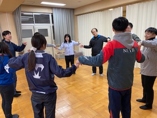 若手の先生を中心に、キャンプファイヤーや学級での楽しめる、スタンツの研修会を行いました。様々な声を出したり、動いたり、10以上のスタンツを学びました。学んだことを、これからの学習にいかしていきます。
