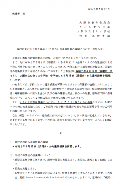 通常授業の再開について