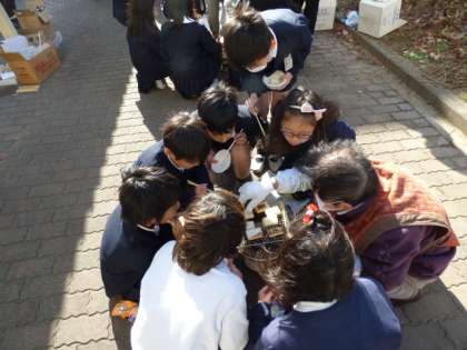 たくさんの資料をもとに昔のお話をうかがったり、七輪と炭をつかって餅焼き体験をしたりしました。