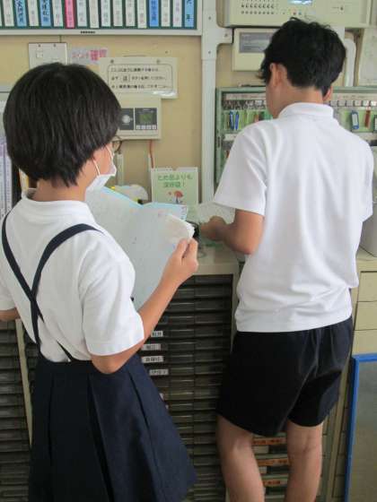 今日は1学期の終業式でした。新型コロナウイルス感染症対策として、職員室から放送で行いました。校長先生からは、1学期の児童たちが頑張ったことに対する称賛や1学期の通知票について、2学期に期待すること等の話がありました。6年生の2名が委員会活動や学習について、また、1年生のお世話など1学期に頑張ったことを児童代表のことばとして話しました。