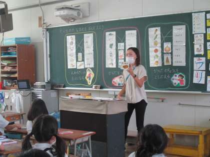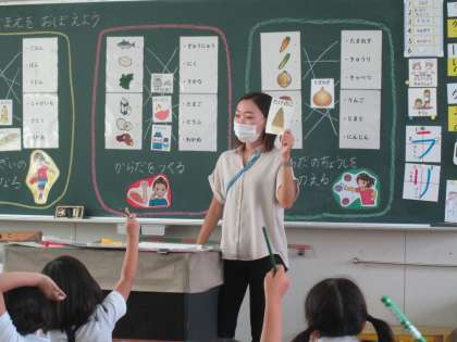 淀川区の栄養教育推進事業として1年生を対象に栄養士による栄養指導がありました。1年生は楽しみながら、三大栄養素について学びました。