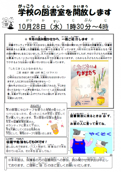 今年度初めての図書ボランティアさんによる図書館開放が10月28日にあります。