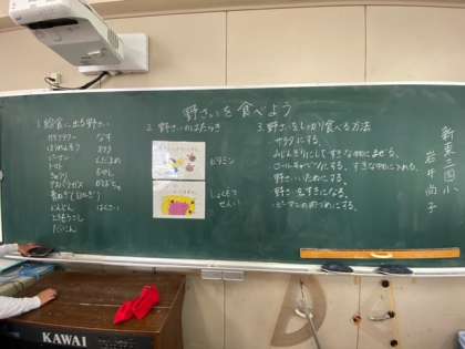 「野さいを食べよう」をテーマに学習が始まりました。1日に必要な野菜の量や、野菜を食べることで体にどのような働きがあるのかを学びました。また、子どもたちは給食ではどんな野菜が出るかな?と考えたり、どうすればたくさんの野菜を食べることができるかを考えたりしました。子どもたちからは、「カレーにしたらたくさん野菜が食べれそう」や「みじん切りにして好きな食べ物に混ぜるとたくさん苦手な野菜も頑張れそう」など、様々な考えを聞くことができました。