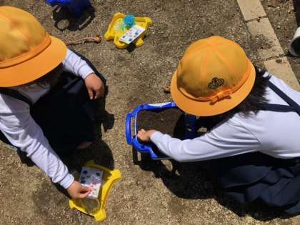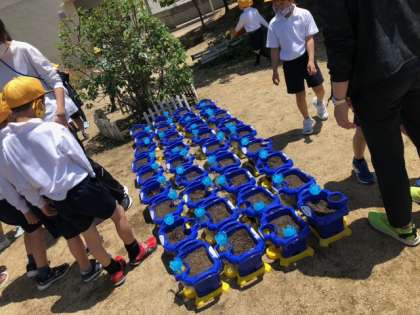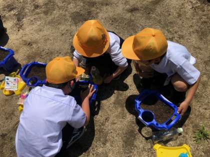 教室でアサガオの種の観察をした後、木川ランドで自分の植木鉢に種を植えました。「早くおおきくなってね!」「きれいな花を咲かせてね!!」と気持ちを込めて植えていました。子どもたちは、いつ芽がでるか、わくわくどきどきしていました!!