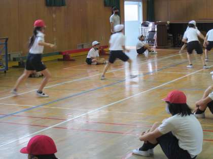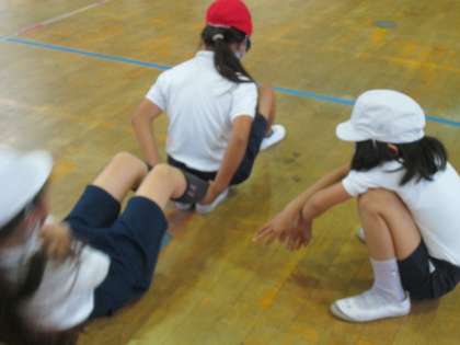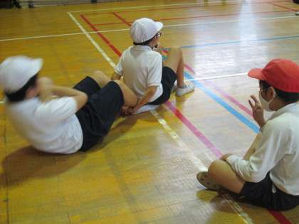 本日の体育の時間は雨天のため講堂で、1組と2組が一緒に、新体力テストの「上体起こし」と「反復横跳び」の計測を行いました。みんな一生懸命、真剣に取り組んでいました。