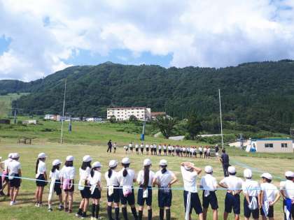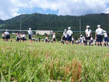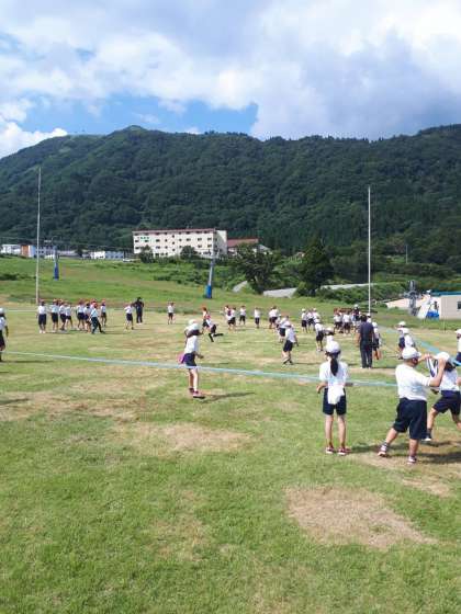写真は、学級対抗「しっぽとり鬼」の様子です。