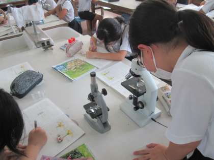 上 顕微鏡で花粉を観察する児童