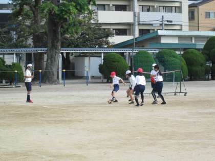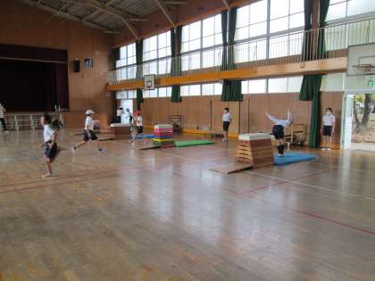 運動場で学習するときはサッカーを、体育館で学習するときは跳び箱に取り組んでいます。今日は1組がサッカーでオリエンテーションと試しのゲームを行いました。1組は体育館で開脚跳びに取り組みました。