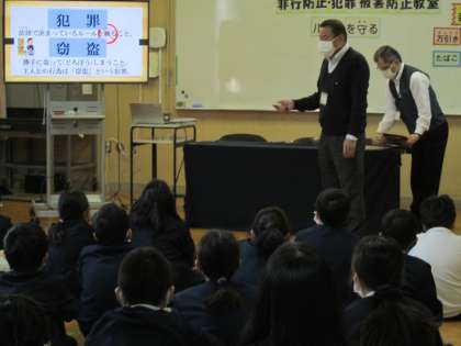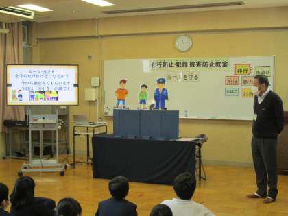 本日の3時間目に5年生の児童を対象に多目的室で大阪府梅田少年サポートセンターの方による非行防止・犯罪被害防止教室がありました。非行とは何か、社会のルールを守る大切さ等を人形劇やお話を通して学びました。「ルールを守る」「思いやりの気持ちをもつ」「断る勇気をもつ」の3つが大切なことをだと教えていただきました。