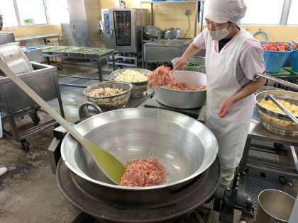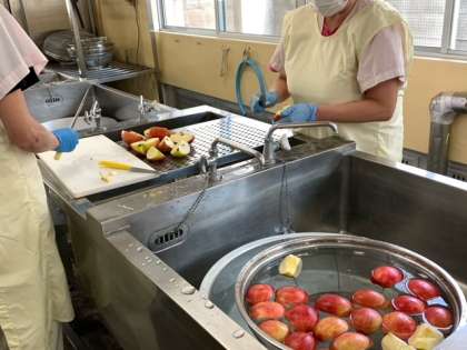 給食室での作業を見ていると、調理員さんが作業ごとにエプロンを変えられていることに気づきました。