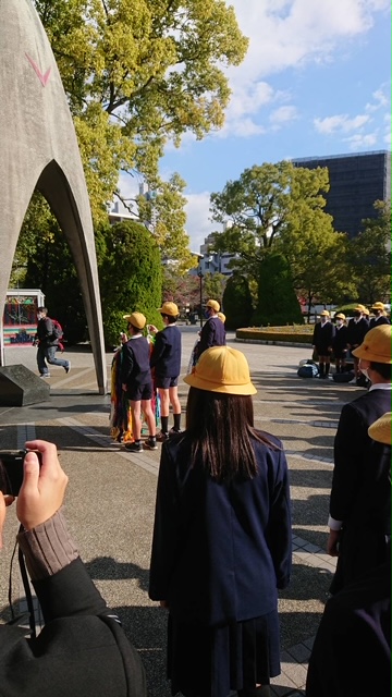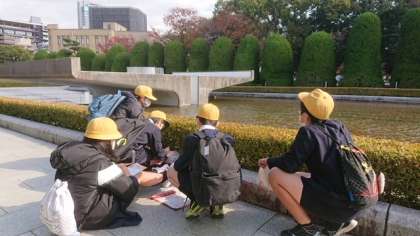 平和セレモニーを終え、平和記念公園でオリエンテーリングをしています。