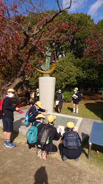 慰霊碑や像を見ながらメモをとるなどして、平和の大切さを肌で感じ取っています。