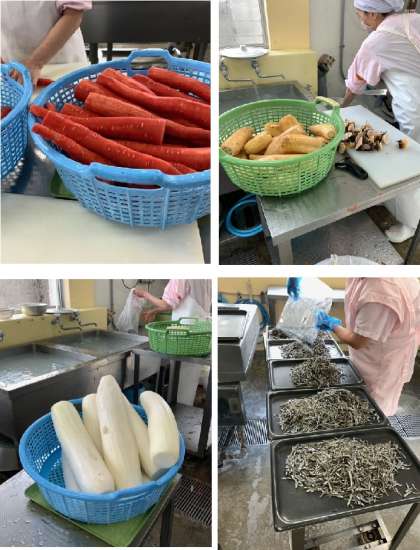 給食室に入ると、たくさんの野菜やごまめ、調味料が準備されていました。