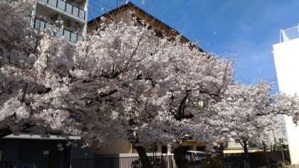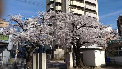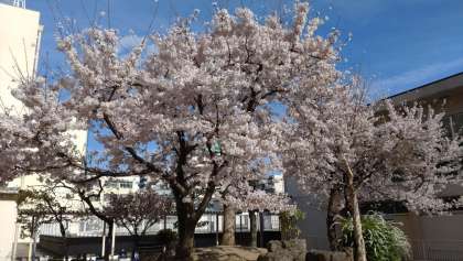 校庭だけでなく、学校のいろいろな場所で桜が満開です。写真は、上から西側、東側、北側の校舎横に咲いている桜です。