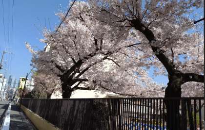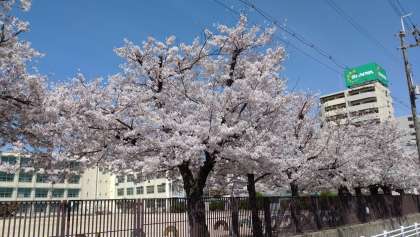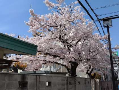 学校の外から校庭の桜を写しました。上から、南側、北側、東側から見た桜です。通りゆく多くの人も満開の桜を見ています。