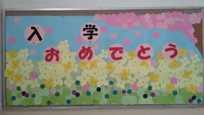新1年生の子どもたちのために、廊下や教室では、入学をお祝いする掲示物が飾られています。