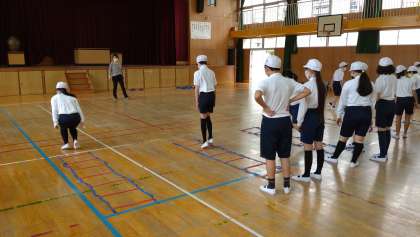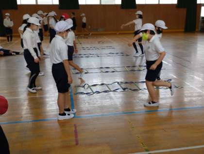 体つくりの運動に取り組みました。跳躍やステップをふんで、巧みな動きを高めています。