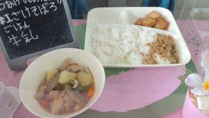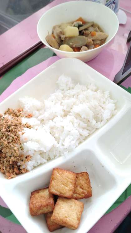 今日の給食は、鶏肉とじゃがいもの煮もの、あつあげのしょうゆだれかけ、紅ざけそぼろ、ごはん、牛乳です。