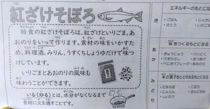 給食の紅ざけそぼろは、紅ざけといりごま、あおのりをいって作ります。素材の味をいかすため、料理酒、みりん、うすくちしょうゆだけで味つけしています。いりごまとあおのりの風味も味わうことができます。