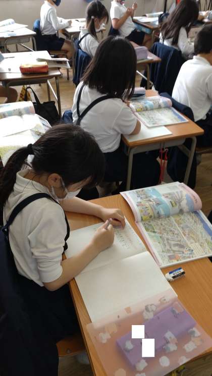 自分たちの住むまちや市の様子や土地の使われ方などについて話し合いました。教科書や白地図などの資料も活用しながら調べ考えています。