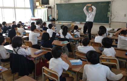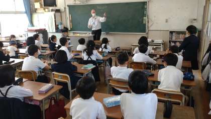 C-NETの先生と英語で交流しました。写真は、チーム対抗での英語のゲームや先生のクェッションタイムでの交流の様子です。