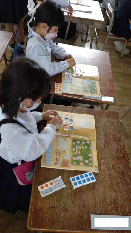 ブロックを使って、数の学習に取り組みました。教科書を見て、課題解決しています。