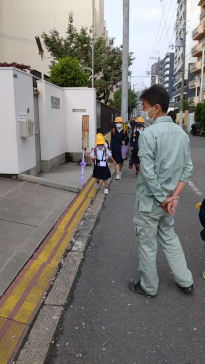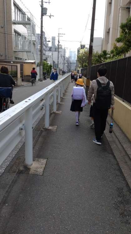 今朝も、子どもたちは、丁寧に挨拶・会釈をして登校しています。写真は、正門で見守る管理作業員さんに挨拶し、しっかりと歩道を歩き登校する子どもたちの様子です。