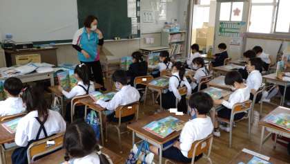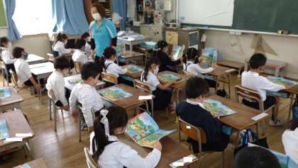 「うたって おどって なかよく なろう」の学習をしました。歌を聴いて教科書の挿絵を見ながら、描かれている動物や植物などを見付け、パントマイムで発表しました。