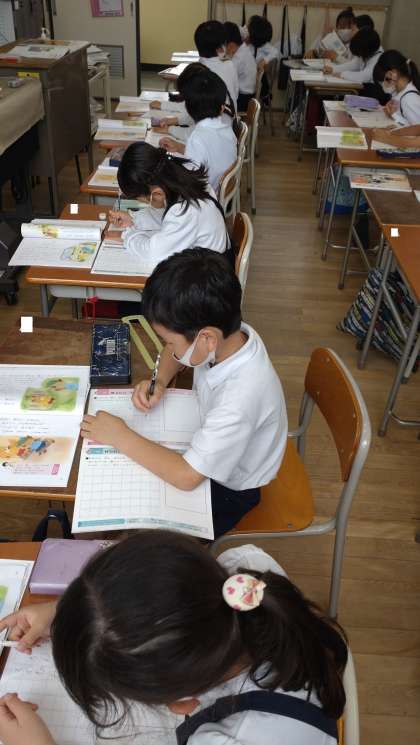 教材「ぽんたと かんた」の学習をしました。してよいことと、してはいけないことで,どうしようか迷ったことを思い出して話し合いました。物語の主人公が、友達からの誘いと約束とで迷いながらも、自分で「いけないことはしない」と決めることができた気持ちを通して、自らよいと思うことを進んで行うことの大切さについて考えました。
