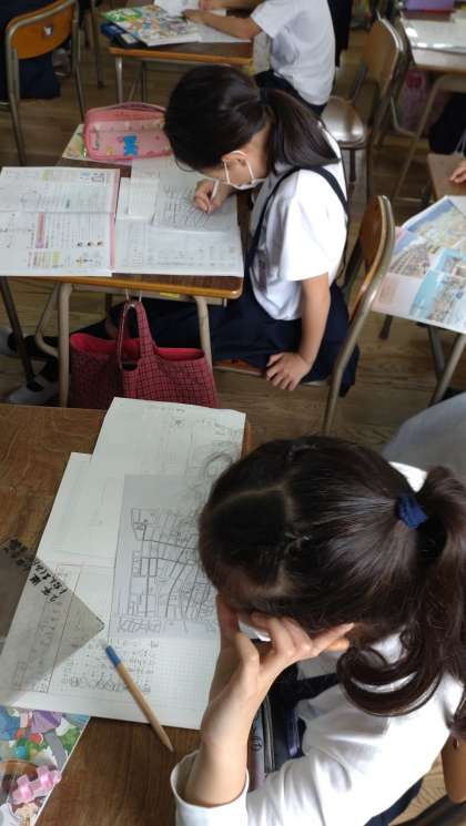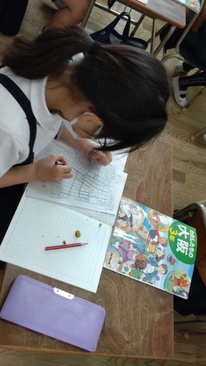 「大阪市のようすと人々のくらし」の学習をしました。通学路の様子について通学路の地図に周辺の様子を思い出しながら、文や絵でかいています。。