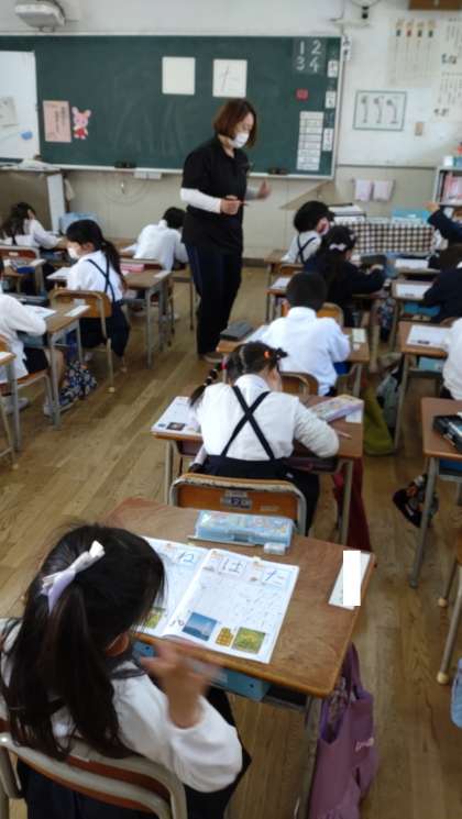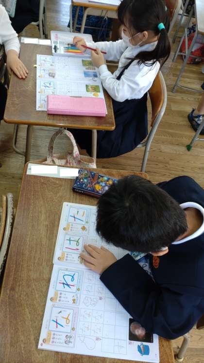 ひらがなの学習をしました。「た」「は」の新しいひらがなを学んでいます。子どもたちは、とても丁寧にドリルに書いています。