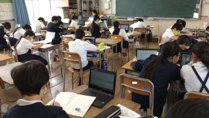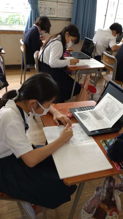 6年生は、来週13日(金)に、ピース大阪へ社会見学に行きます。事前学習として、パソコンを活用して、戦争中の大阪大空襲などを調べています。子どもたちは、調べたことを丁寧にノートに記録しています。