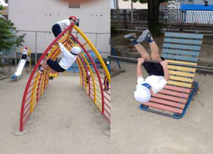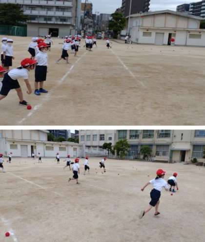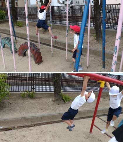 ボールや固定施設を使った運動遊びに取り組みました。ボールを投げたり、のぼり棒やうんてい、鉄棒など、子どもたちは自分にできそうな易しい動きを考えたりして、楽しく動きを身に付けています。