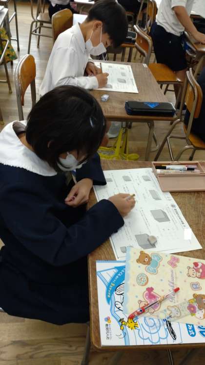 体積の学習をしました。直方体や立方体の体積の求積や容積など、これまでの学習を振り返っています。
