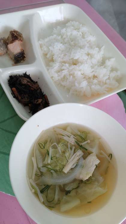 今日の給食は、さけのごまみそ焼き、五目汁、ひじきのいため煮、ごはん、牛乳です。
