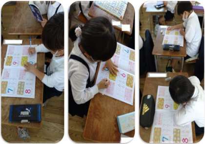 10までの数について学習しました。10までの数について、数字のかき方を理解して正しくかき、順序よく数える学習に取り組んでいます。