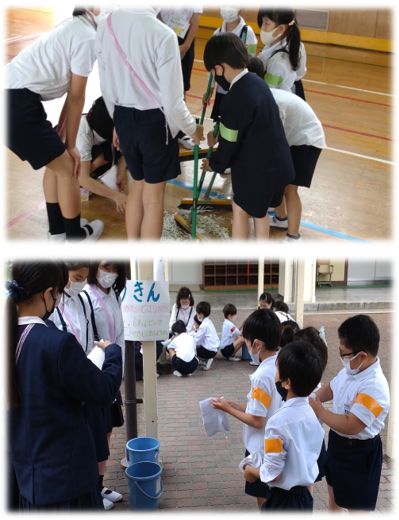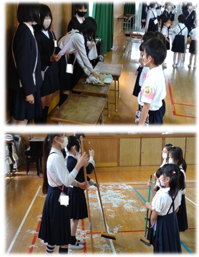 6年生が1年生のためにお掃除の仕方を教えました。ぞうきんやほうきの使い方、机椅子の運び方など、グループに分かれて1年生に教えています。写真は、最初のあいさつから、それぞれのグループの活動の様子です。6年生が優しく1年生に教える姿は、とても素晴らしいと思います。